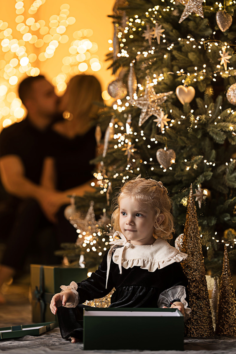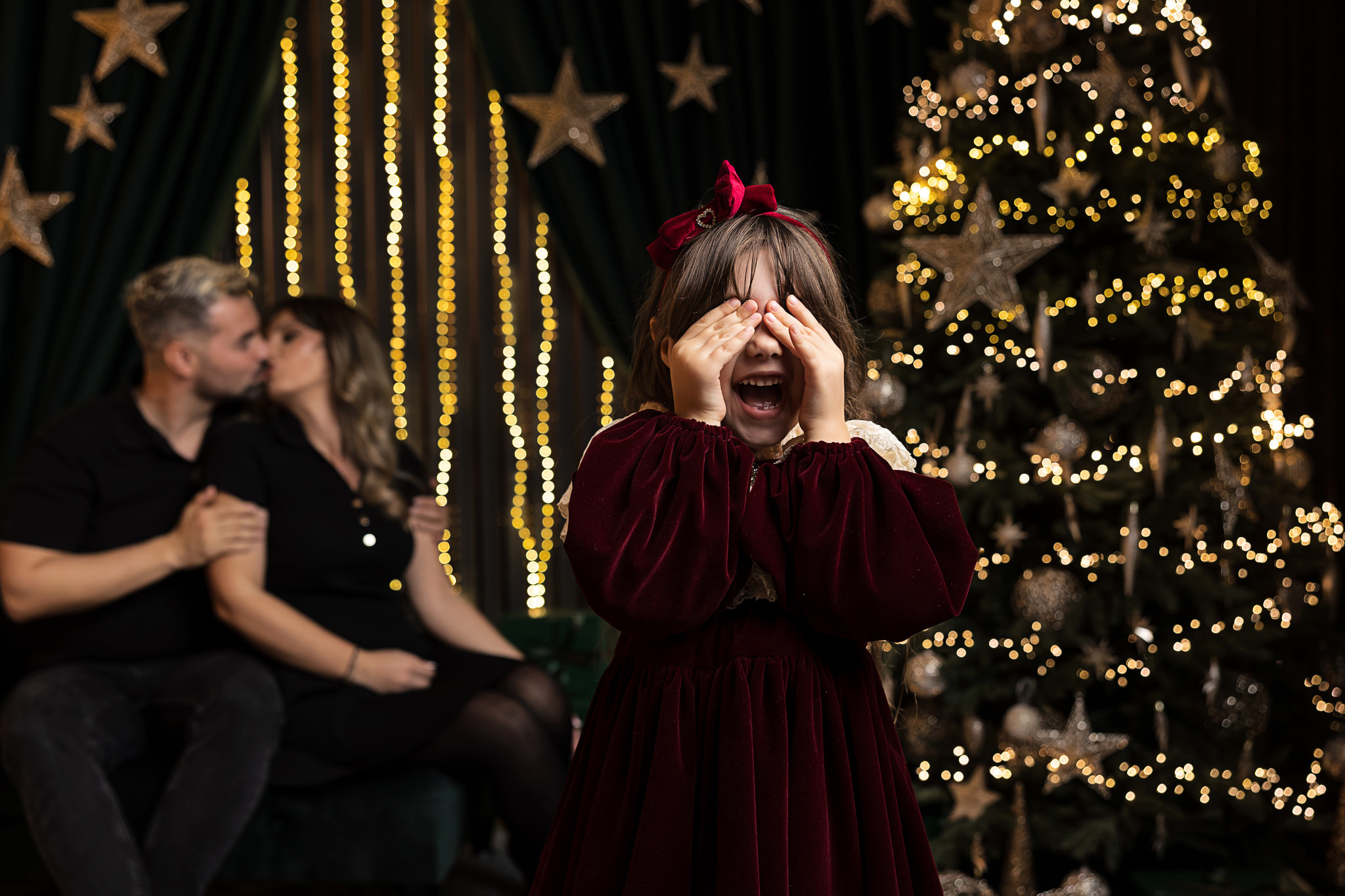 Aici, Crăciunul capătă o eleganță aparte. Luminile se joacă pe crengile bradului, iar atmosfera este una caldă, intimă și sofisticată, perfectă pentru familiile care își doresc fotografii moderne, curate și pline de emoție autentică.