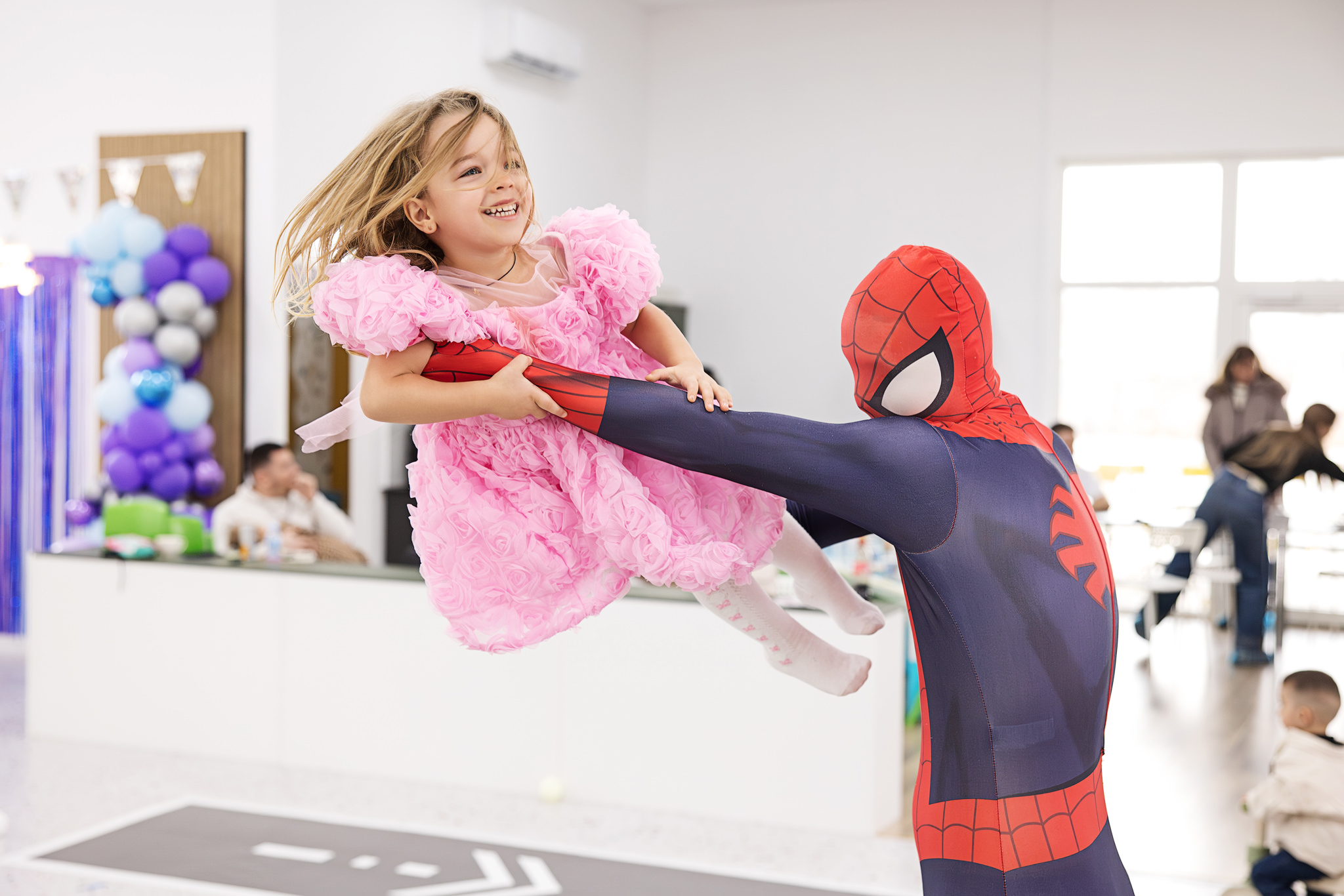 Animatorul Puiu Dan, costumat în Spider-Man, a știut să țină copiii conectați, implicați și relaxați. Iar când copiii sunt prinși în joc, apar cele mai bune cadre: râsete largi, expresii autentice, mișcare.