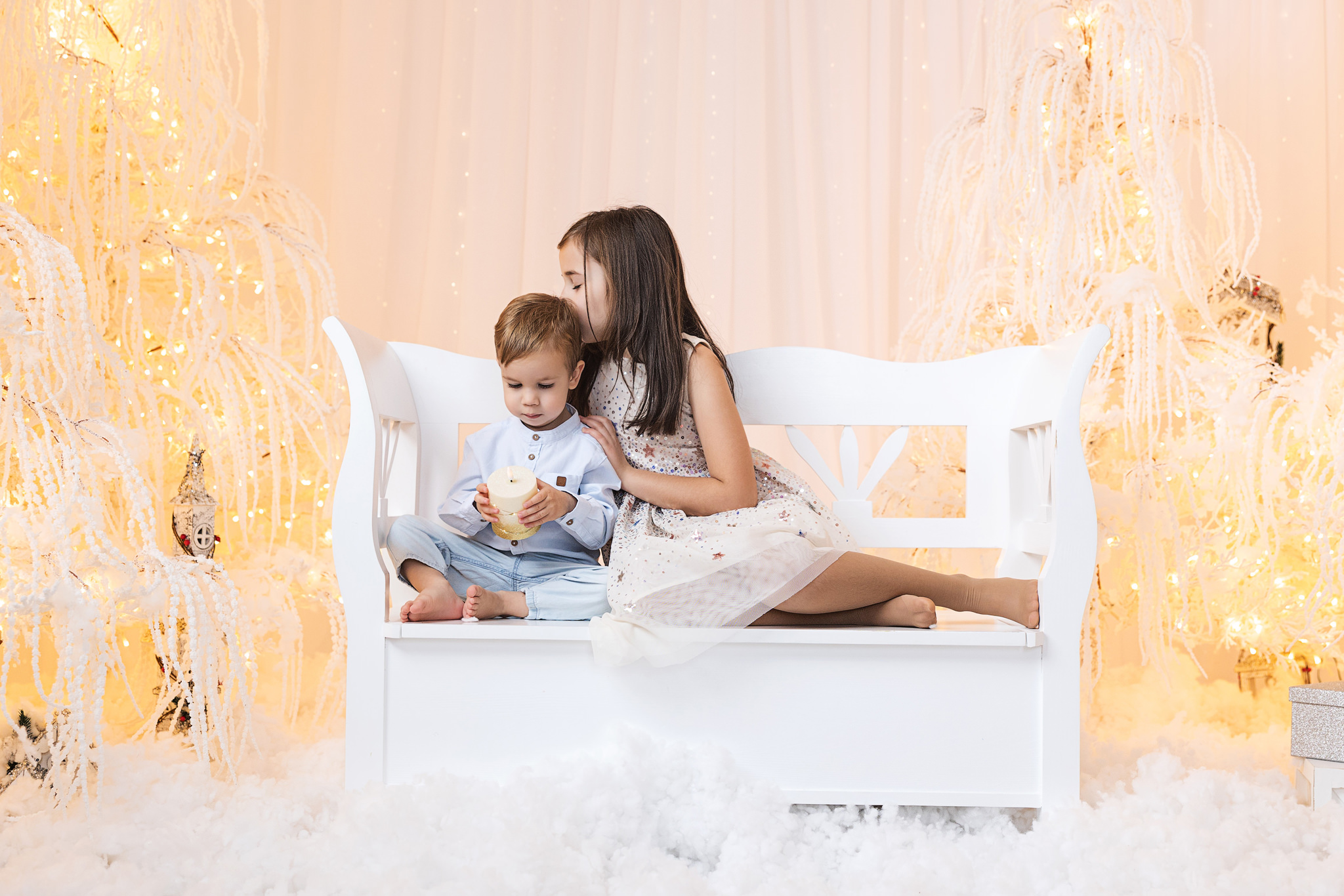 Decorul alb este luminos, curat și plin de detalii care transformă fiecare fotografie într-o imagine desprinsă dintr-un vis de iarnă. Brazi acoperiți de zăpadă, lumini calde și accente argintii creează o atmosferă elegantă și magică, perfectă pentru familiile care iubesc simplitatea și finețea.